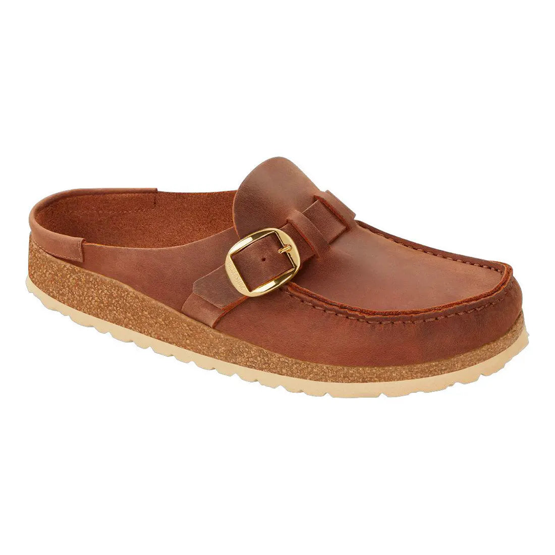 Il modello Birkenstock Buckley cognac è una vera chicca di comodità e stile della grande azienda tedesca. La morbida pelle naturale oliata, dona uno stile unico mentre il plantare sagomato Birkenstock segue la linea del piede, permettendo l'uso, anche per parecchie ore, senza nessun fastidio. La forma a conca piuttosto profonda nella zona del tallone sostiene la fascia plantare e mantiene il calcagno stabilmente nella sua posizione naturale. La parte anteriore del plantare presenta dei rilievi intermedi nella zona delle dita che consentono lo scarico del peso. Le Birkenstock Buckley cognac sono il sabot adatto per gli amanti delle linee stilose.
