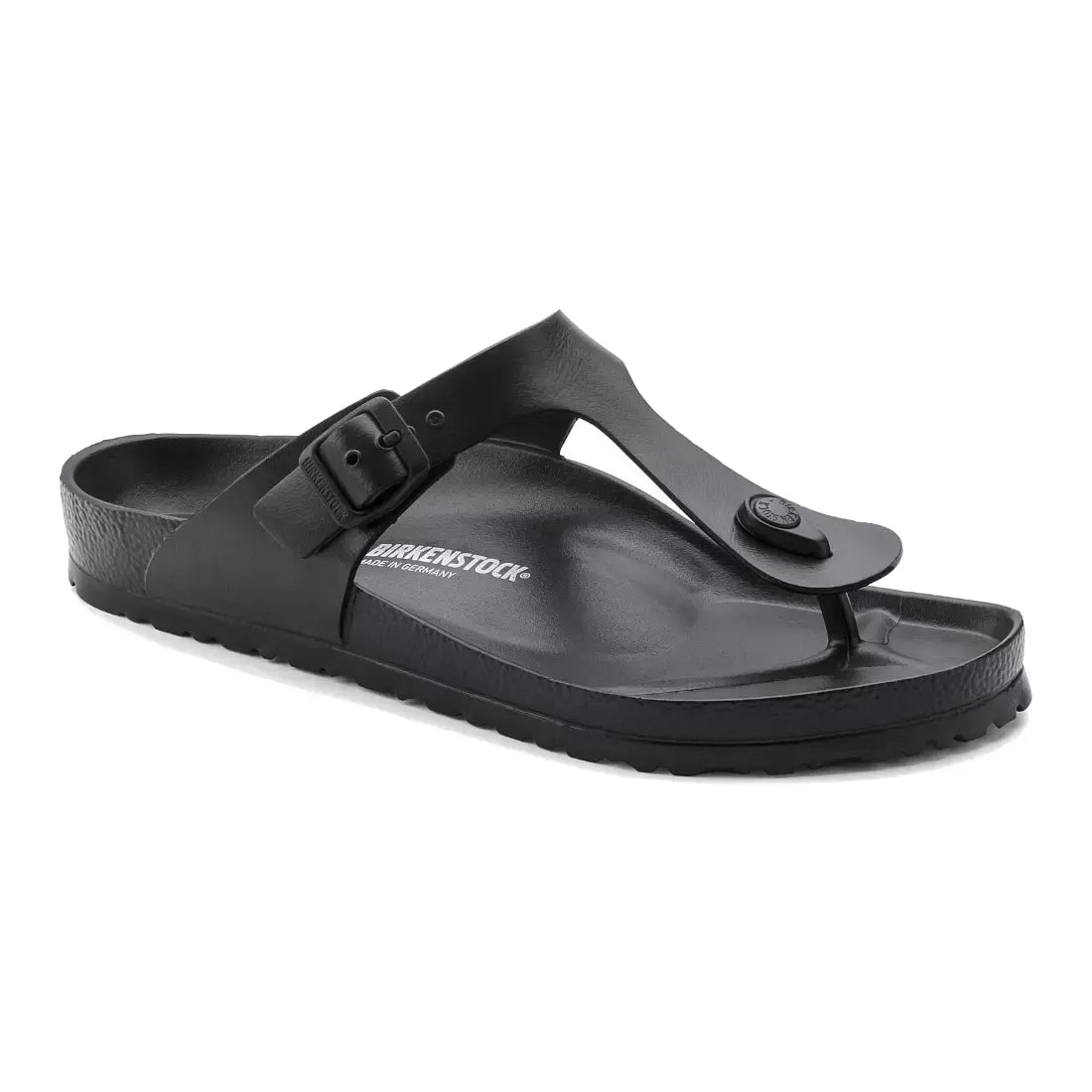 Uno dei modelli classici più venduti della famiglia Birkenstock, le ciabatte Gizeh Eva black si presentano in una versione impermeabile e moderna. Queste ciabatte infradito, una volta indossate, ricordano la leggerezza dei sandali di sughero. Sono prodotte nella pregiata plastica EVA (etilene vinil acetato) molto flessibile, inodore e priva di sostanze nocive che riunisce in sé molte caratteristiche positive: è molto leggera, estremamente elastica, ammortizzante e dermoaffine. Rimangono intatte tutte le caratteristiche del plantare Birkenstock, consentendo ai tuoi piedi di indossarle per ore. Grazie alle loro caratteristiche di impermeabilità e leggerezza, le ciabatte Birkenstock Gizeh Eva black sono molto consigliate per l'uso in acqua o sulla spiaggia.