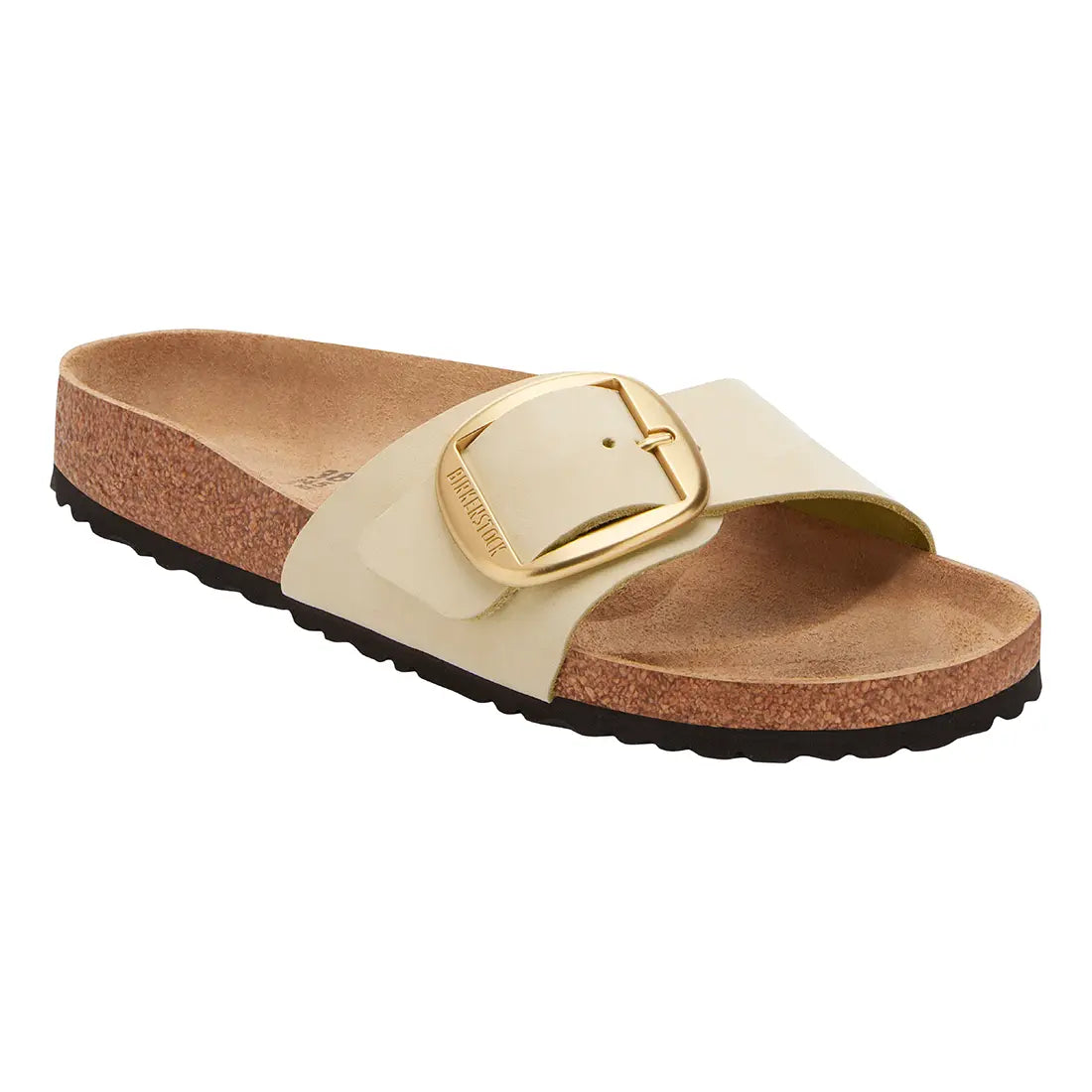 Rivisitazione in chiave moderna dello storico modello Birkenstock, le ciabatte Madrid Big Buckle ecru sono diventate un classico assoluto che piace soprattutto per la sua linea essenziale. Questa versione combina nello stesso modello due motivi di grande successo. Si presenta con un delicato rivestimento dalla brillantezza setata e una grande fibbia ad ardiglione elegante. La tomaia è realizzata in pelle nabuk, resistente e delicato sulla pelle. Grazie al plantare anatomico Birkenstock che segue le linee naturali del piede in colore coordinato, le ciabatte Madrid Big Buckle ecru sono il modello alla moda ideale da indossare quotidianamente.