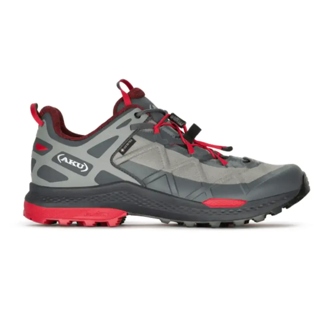 Calzature innovative da fast hiking, le scarpe Aku Rocket Dfs Gtx uomo sono un modello affidabile da usare su percorsi impegnativi. Grazie alla nuova suola Vibram Rocket traction lug che lavora in abbinata con la struttura Megagrip, la stabilitĂ e la trazione a terra sono ad un livello altissimo. La calzata Performance Fit presente in questa calzatura, serve per aumentare la sensibilitĂ e la precisione durante la camminata. Il sistema Elica offre un'ammortizzazione bilanciata e diversificata tra avampiede e tallone, donando un'ottima ripartizione dei carichi e grande stabilitĂ anche nei tratti veloci. Il nuovo sistema a doppia allacciatura Dual Fit System, permette di adeguare il comfort e la precisione della calzata nelle diverse fasi di utilizzo: un laccio tradizionale per la massima comoditĂ durante la camminata ed un fast lacing per aumentare sensibilitĂ in fase di arrampicata. La tomaia in tessuto resistente e microfibra con la protezione della membrana Goretex, rendono le scarpe Aku Rocket Dfs Gtx uomo, il modello ideale per le tue uscite giornaliere anche in condizioni climatiche difficili.