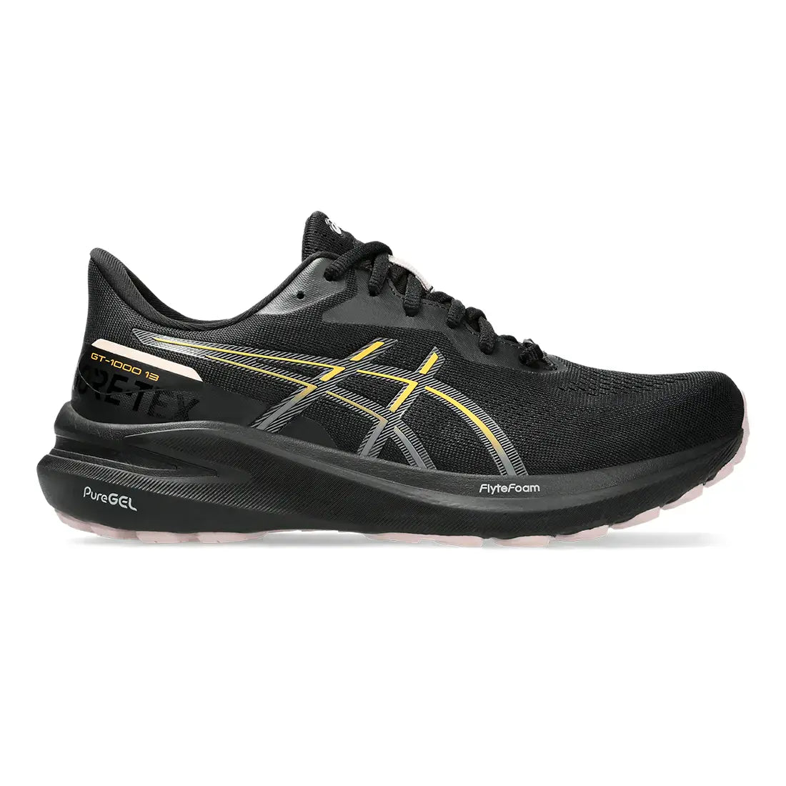 Le scarpe asics GT-1000 13 GTX black donna sono calzature impermeabili perfette da usare per la corsa e per lunghe camminate. Il nuovo sistema anti-pronazione Guidance 3D (rivoluzionato rispetto ai precedenti Duomax e Litetruss) controlla la fase di pronazione non in maniera invasiva: durante la fase di appoggio infatti il piede viene orientato verso l'esterno (la base di appoggio tallonare è ampia) e successivamente accompagnato sull'avampiede per concludere la fase di spinta. Per questo motivo sono molto consigliate sia a chi ha il piede cavo sia a chi ha una leggera pronazione. La membrana Goretex garabtisce la totale idrorepellenza. In negozio, le scarpe asics GT-1000 13 GTX black donna le abbiamo consigliate anche come calzatura da lavoro (es per chi svolge un lavoro all'aperto o a contatto con acqua) con ottimi feedback da parte dei clienti. Â