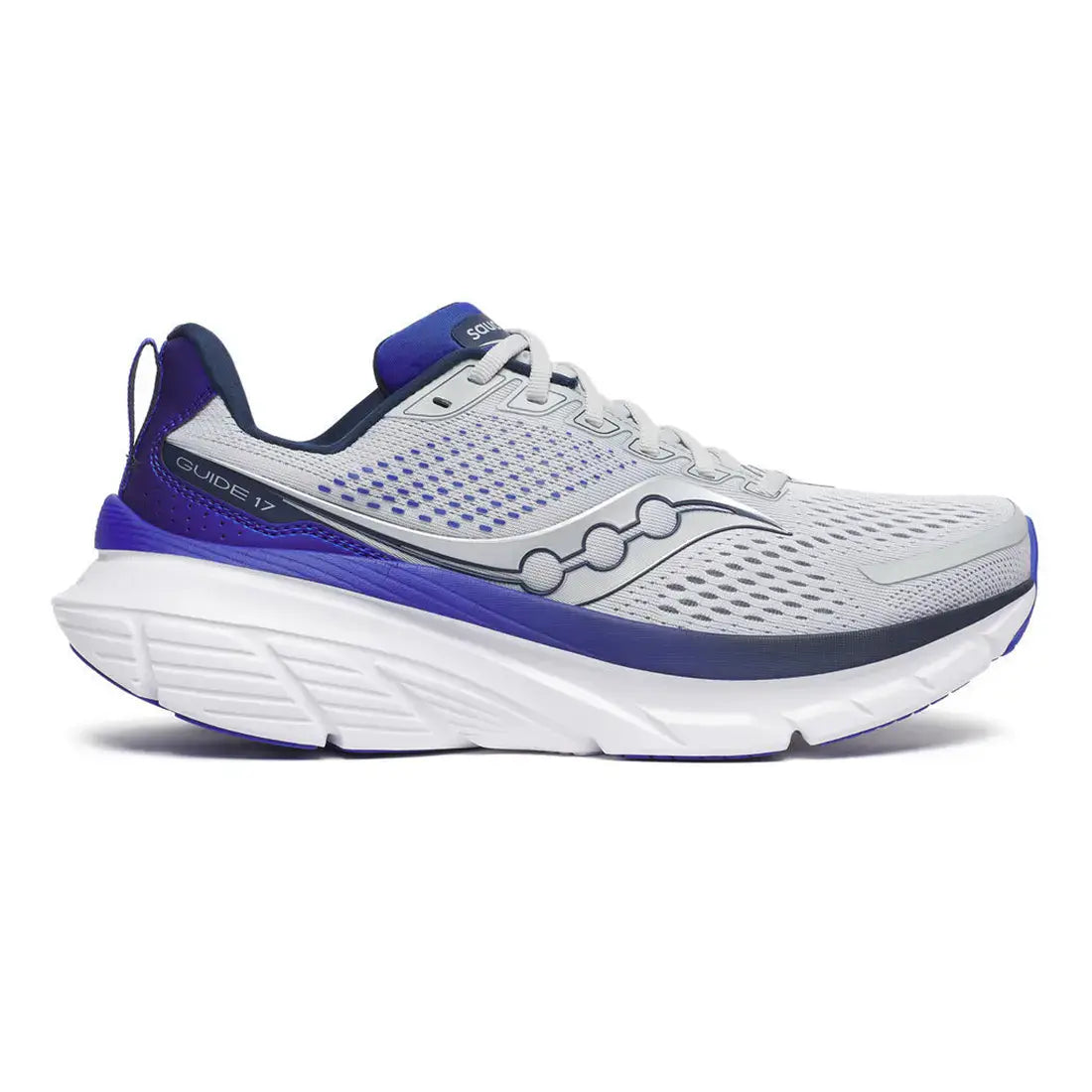 Le scarpe Guide 17 cloud uomo sono calzature anti-pronazione consigliate per pronatori e per chi ha il piede cavo. La calzata è medio larga e la tomaia molto comoda e confortevole. Il drop di 6 mm, relativamente basso, favorisce una veloce transizione tacco-punta. Le scarpe Saucony Guide 17 cloud uomo nascono da corsa, anche se in negozio le abbiamo vendute, con ottimi risultati, per lunghe camminate.Â